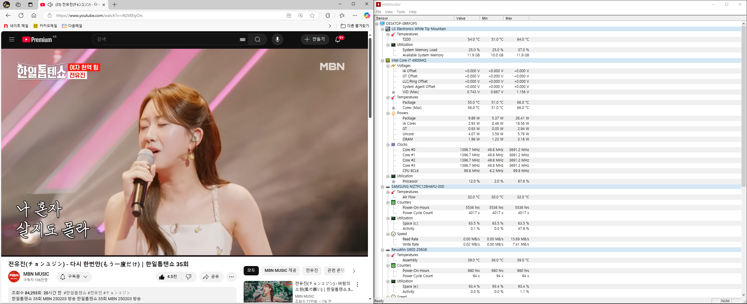 유튜브(2브라우저) 시청시 하드웨어 모니터 상태